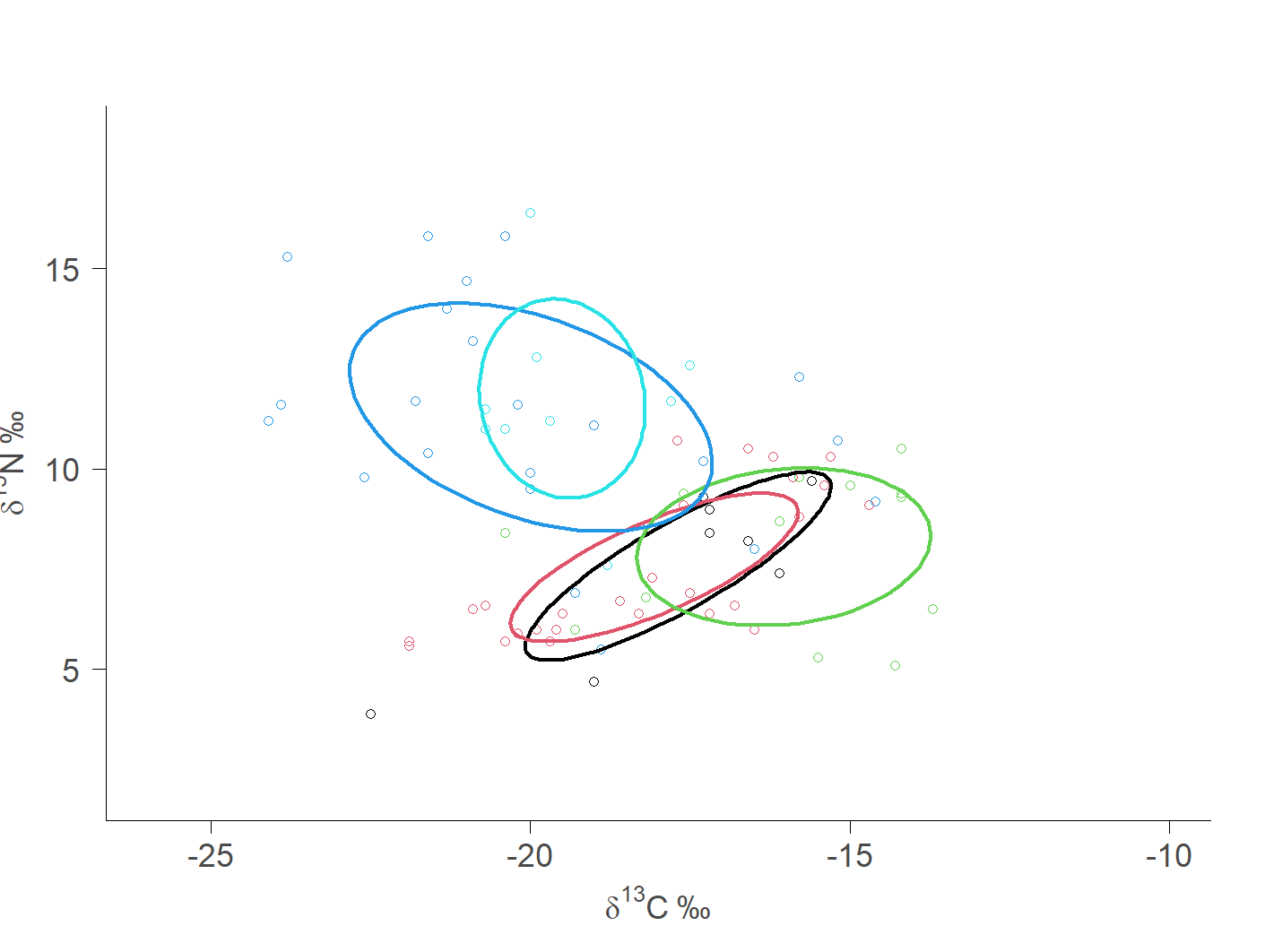 First, let’s check out the original graph that I exported from R using SIBER. If you’ve never heard of SIBER, it is a fantastic tool for analyzing and summarizing stable isotope data. Check out the original article by Jackson et al. (2011).